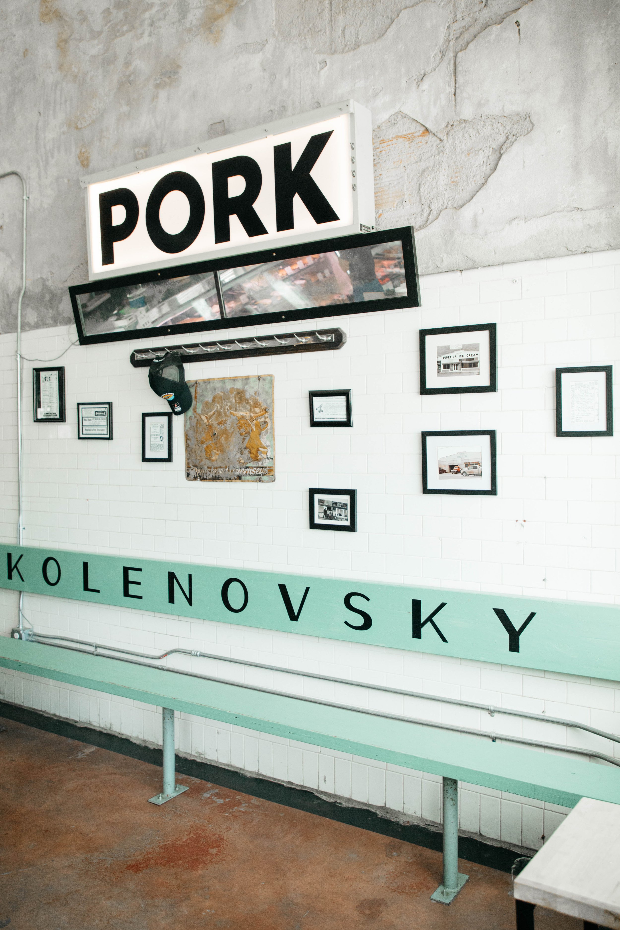 BOARRI was built in a former Piggly Wiggly where the only remaining resemblance was the original white tile lining walls in the original retail area of the building. The tile was left alone and this butcher shop was built with the building’s history in mind.