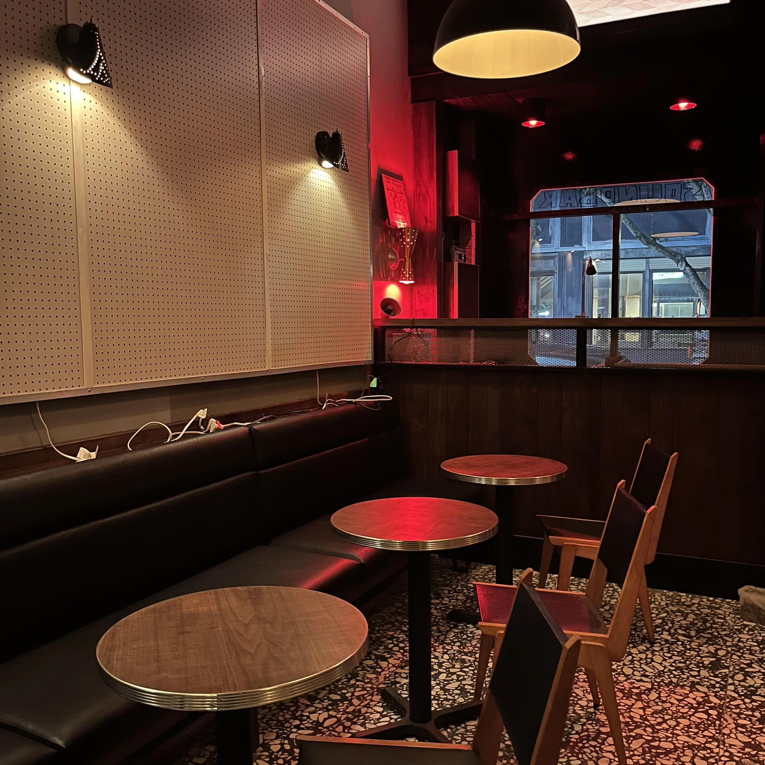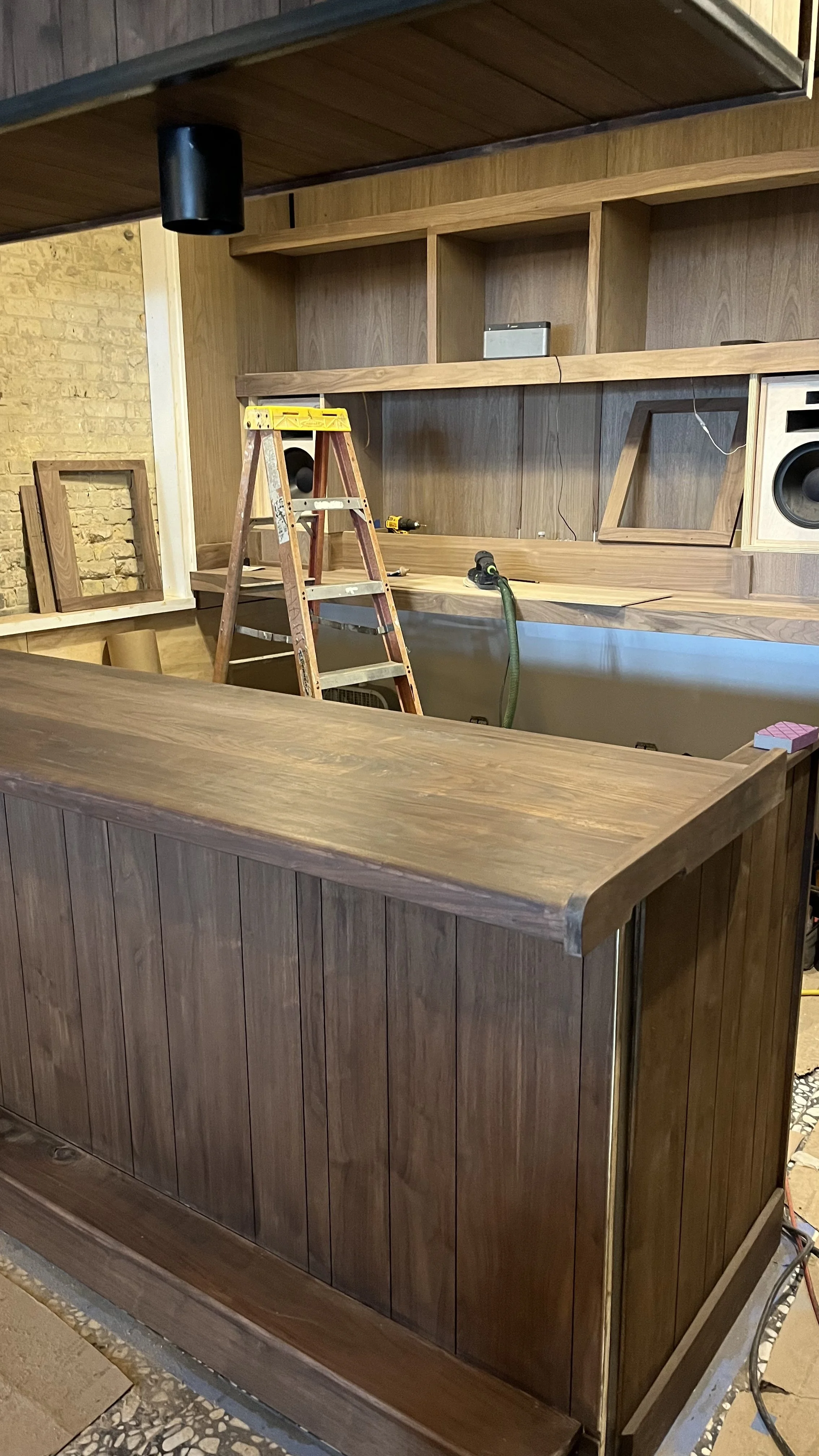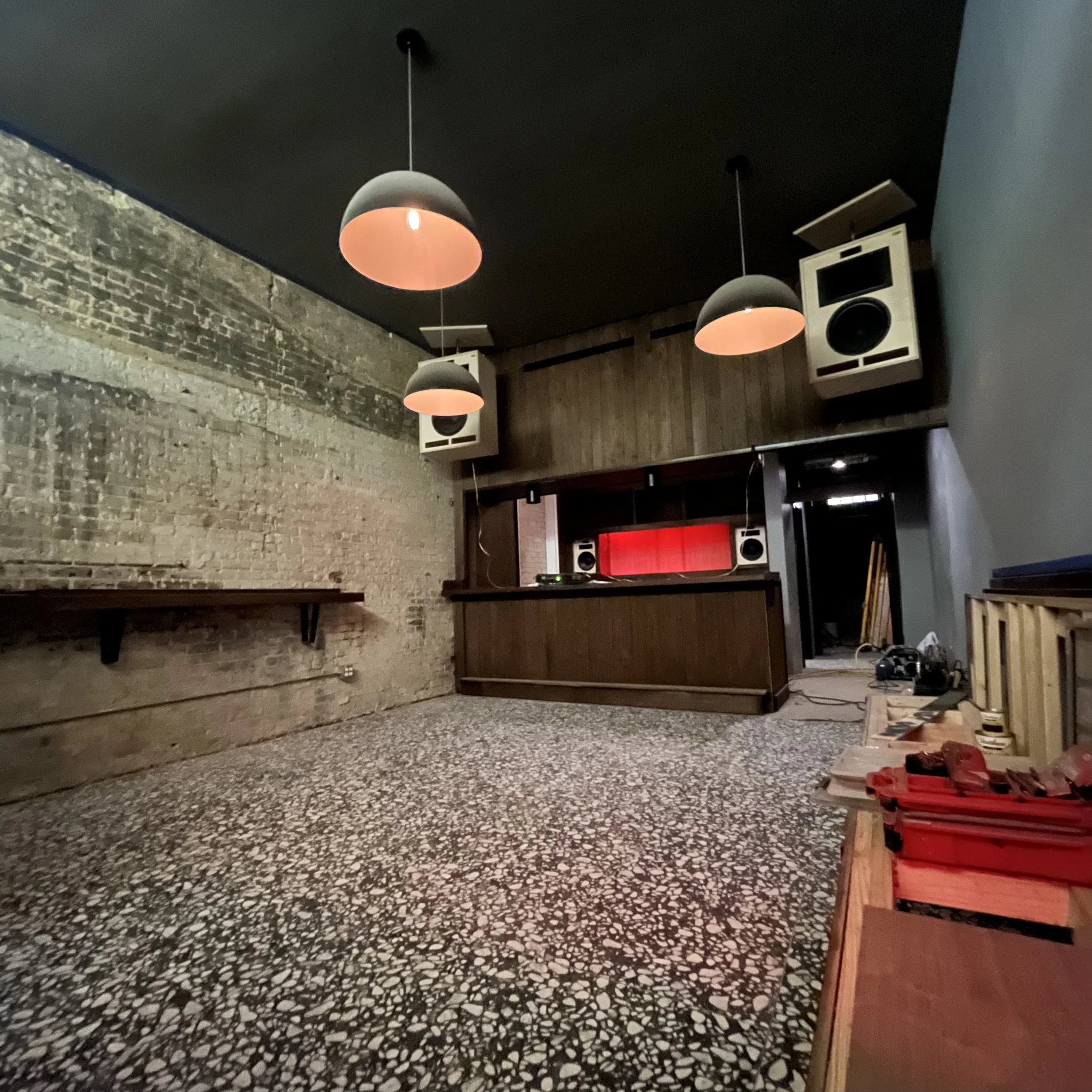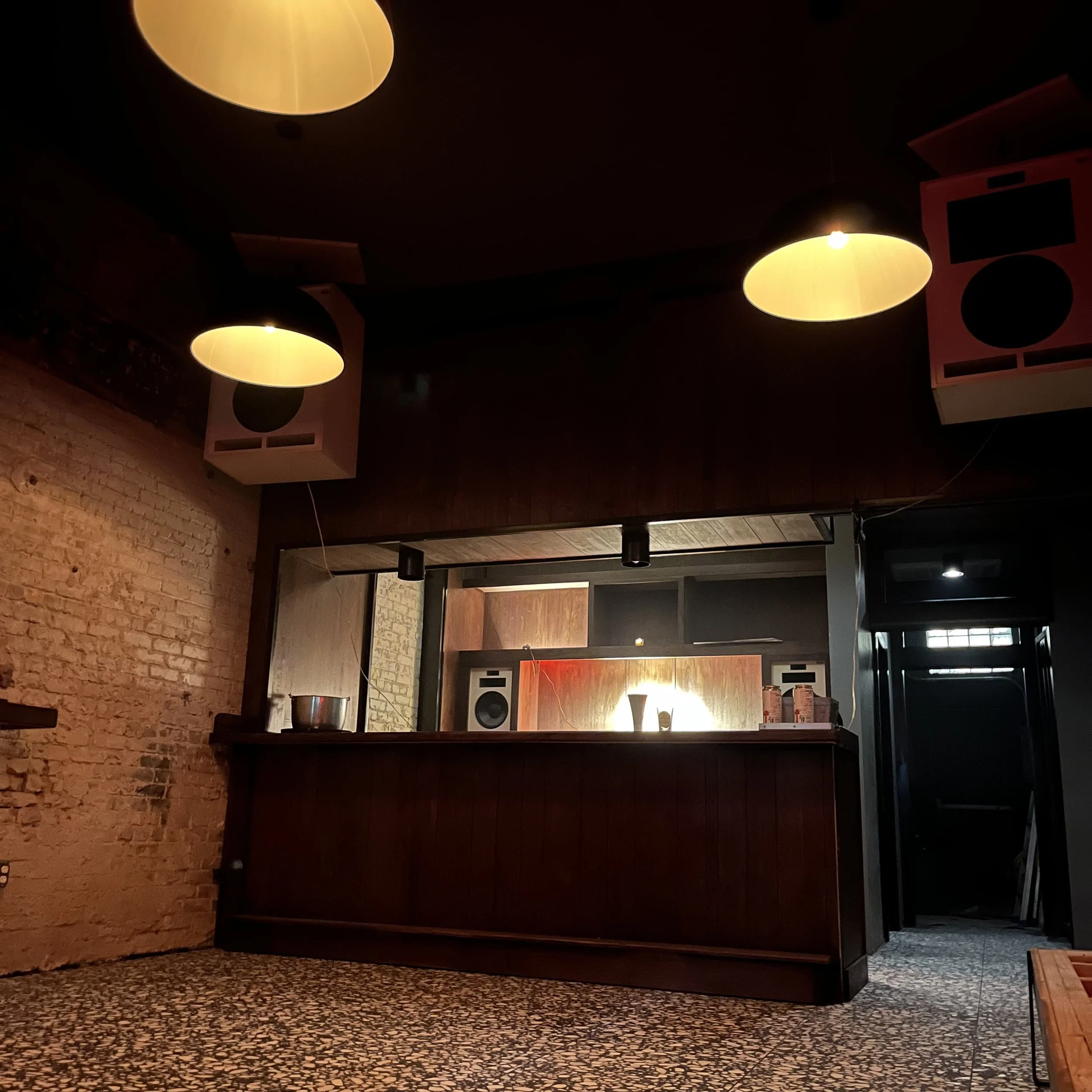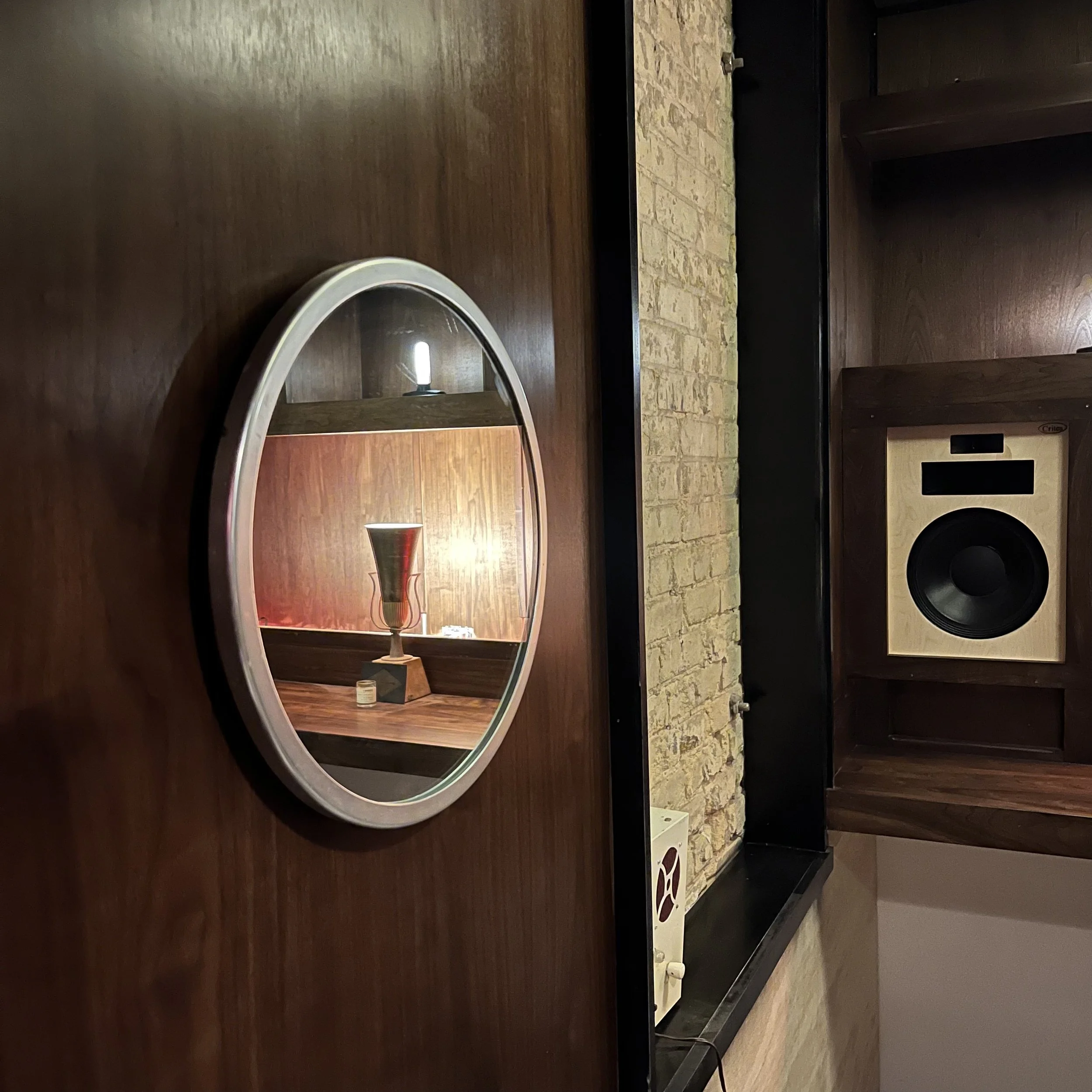 At OKHIFI the focus is always meant to be the music and signature drinks, however all surfaces and details need to match the quality of sound. The 3-way speakers flying overhead are paired with oversized vintage dome lights. At every opportunity vintage fixtures were sourced for lighting and furniture. All the bar units visible to the customers are walnut.