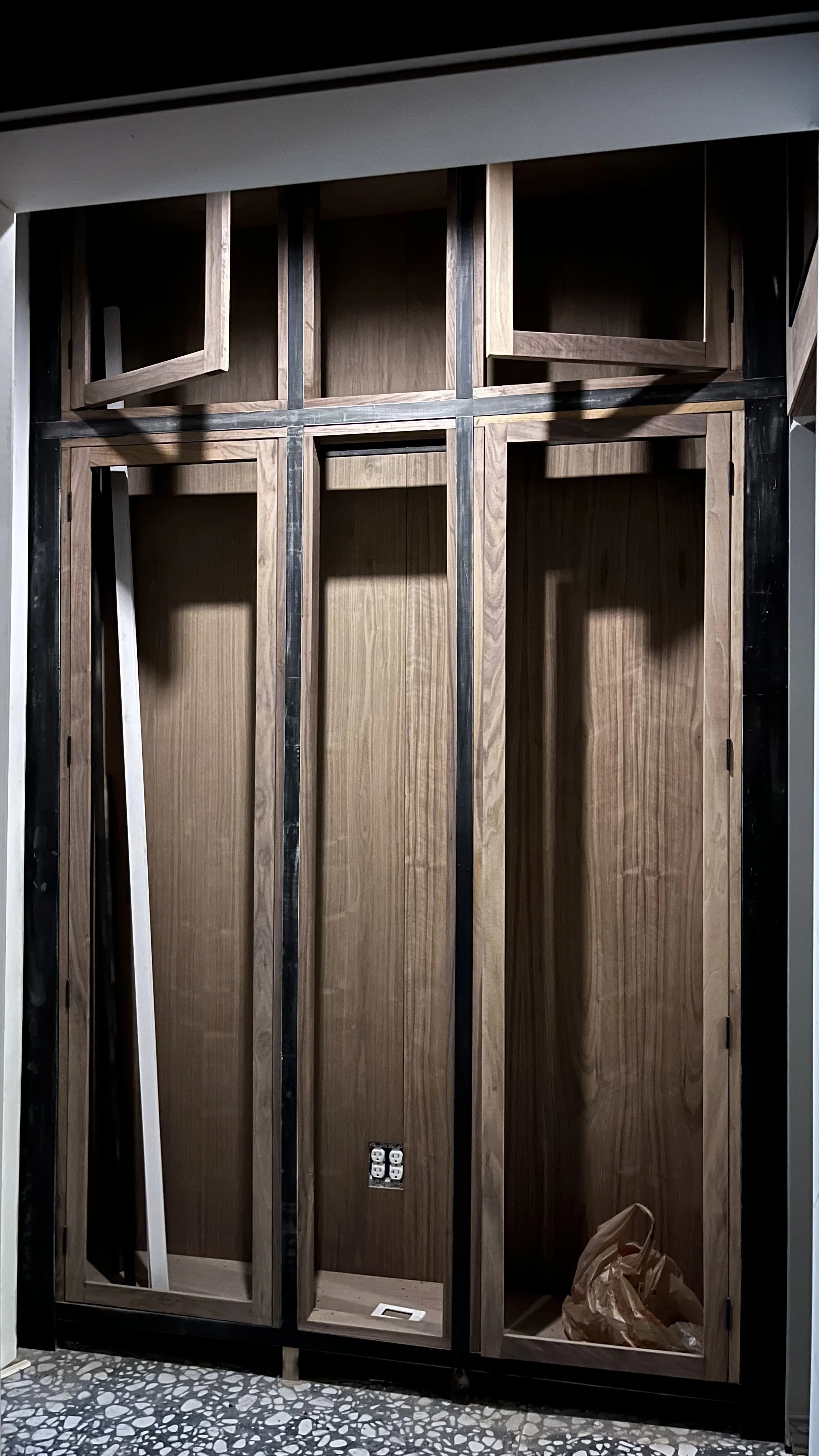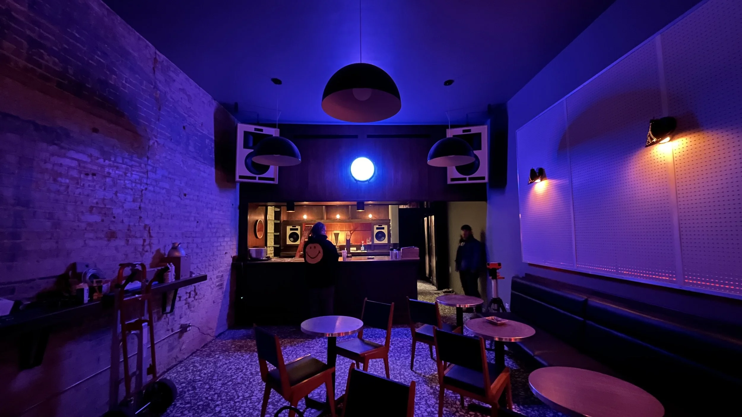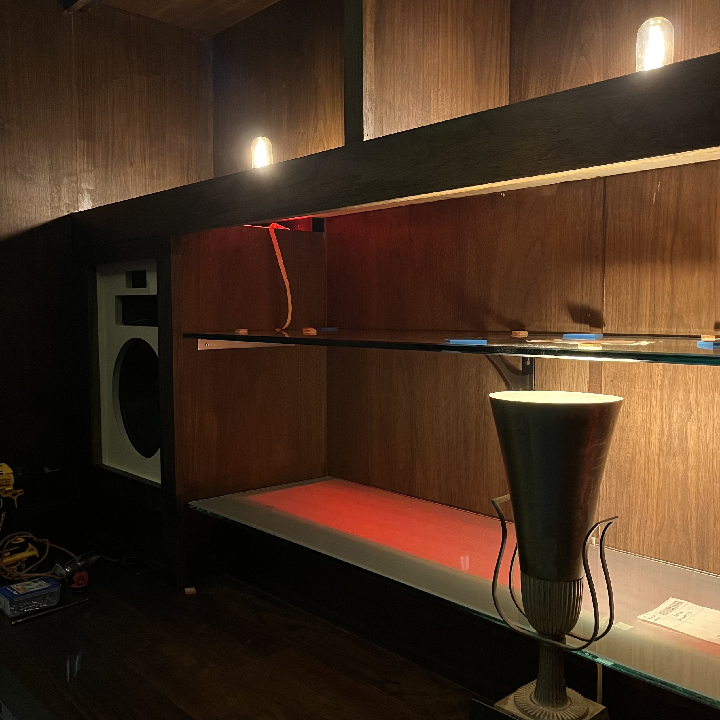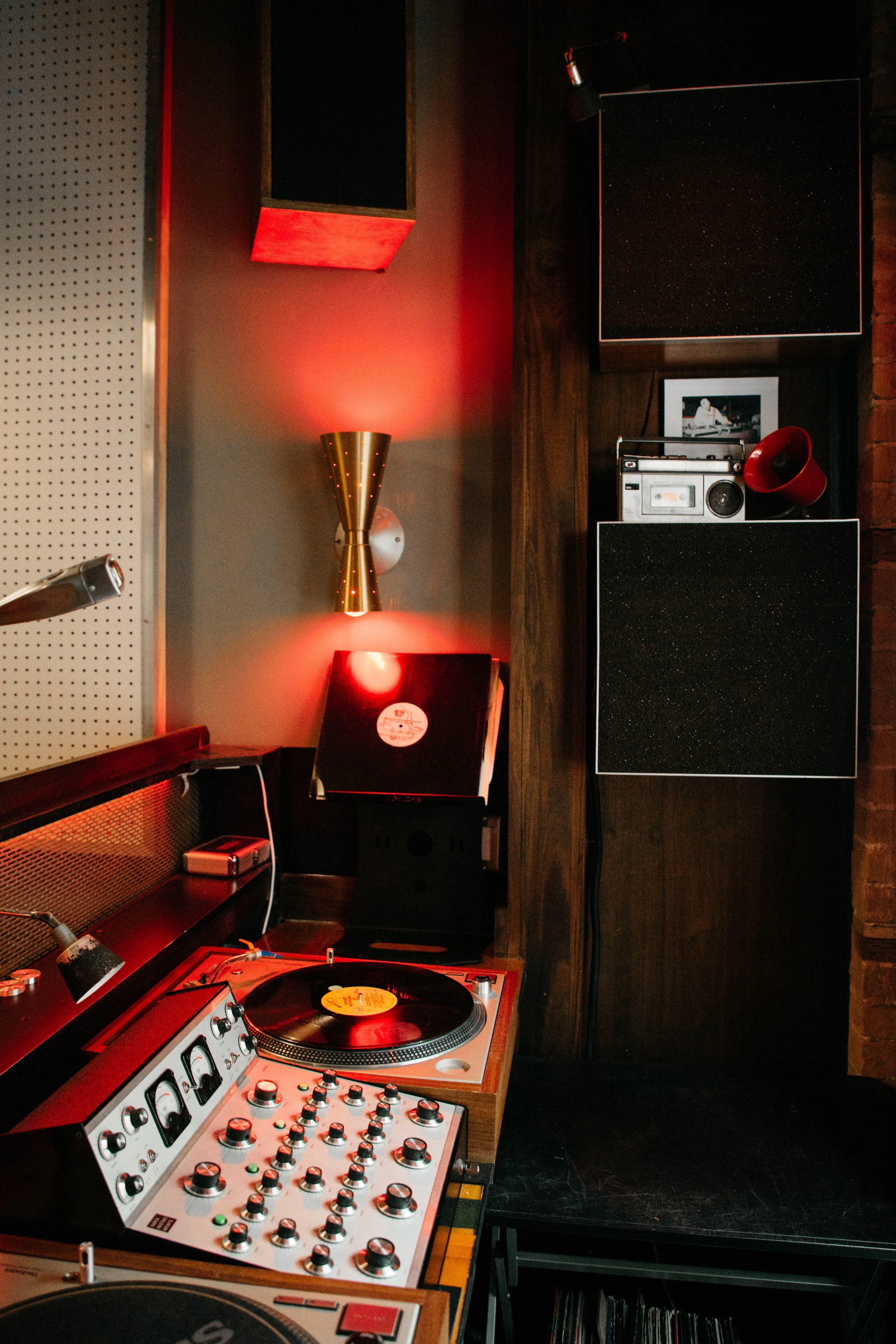 At OKHIFI the focus is always meant to be the music and signature drinks, however all surfaces and details need to match the quality of sound. The 3-way speakers flying overhead are paired with oversized vintage dome lights. At every opportunity vintage fixtures were sourced for lighting and furniture. All the bar units visible to the customers are walnut.